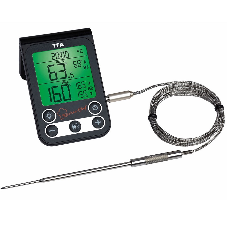 М'ясо та птиця приготовлені ідеально! Готуйте як професіонал зі 100% гарантією успіху. Це пов'язано з тим, що цифровий «2 в 1» термометр для барбекю та духовки KÜCHEN-CHEF повідомляє вам, коли досягнута потрібна температура всередині продукту і ваше м'ясо досягло ідеального обсмажування. У той же час ви можете контролювати максимальний і мінімальний діапазон в духовці. Проникаючий щуп з високоякісної нержавіючої сталі може залишатися в духовці або грилі для барбекю протягом всього процесу приготування. Просто вставте щуп у м'ясо і виведіть термостійкий кабель з духовки. Ультратонкий наконечник щупа забезпечує швидке вимірювання і не порушує структуру м'яса. Коли бажана внутрішня температура буде досягнута - або якщо температура духової шафи вийде за межі запрограмованого діапазону, - ви почуєте звуковий сигнал. Поставте або повісьте прилад біля духовки. Апарат простий у використанні і дуже легко читається завдяки яскраво освітленому дисплею. KÜCHEN-CHEF також ідеально підходить для приготування при низьких температурах.