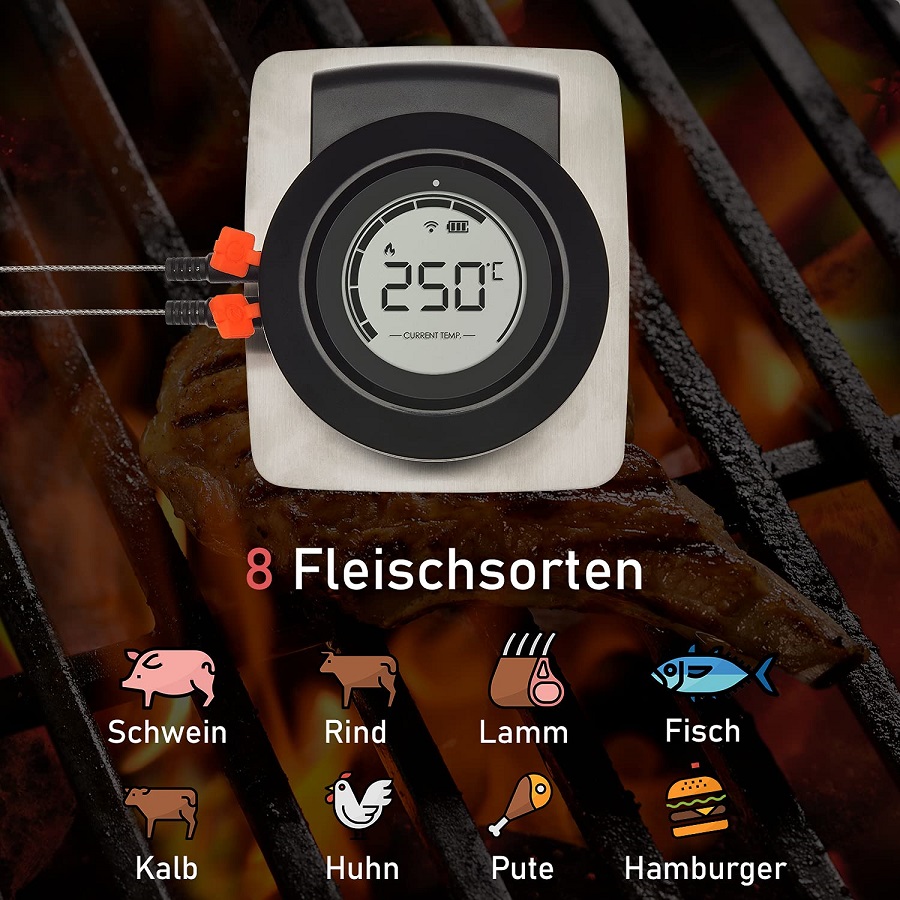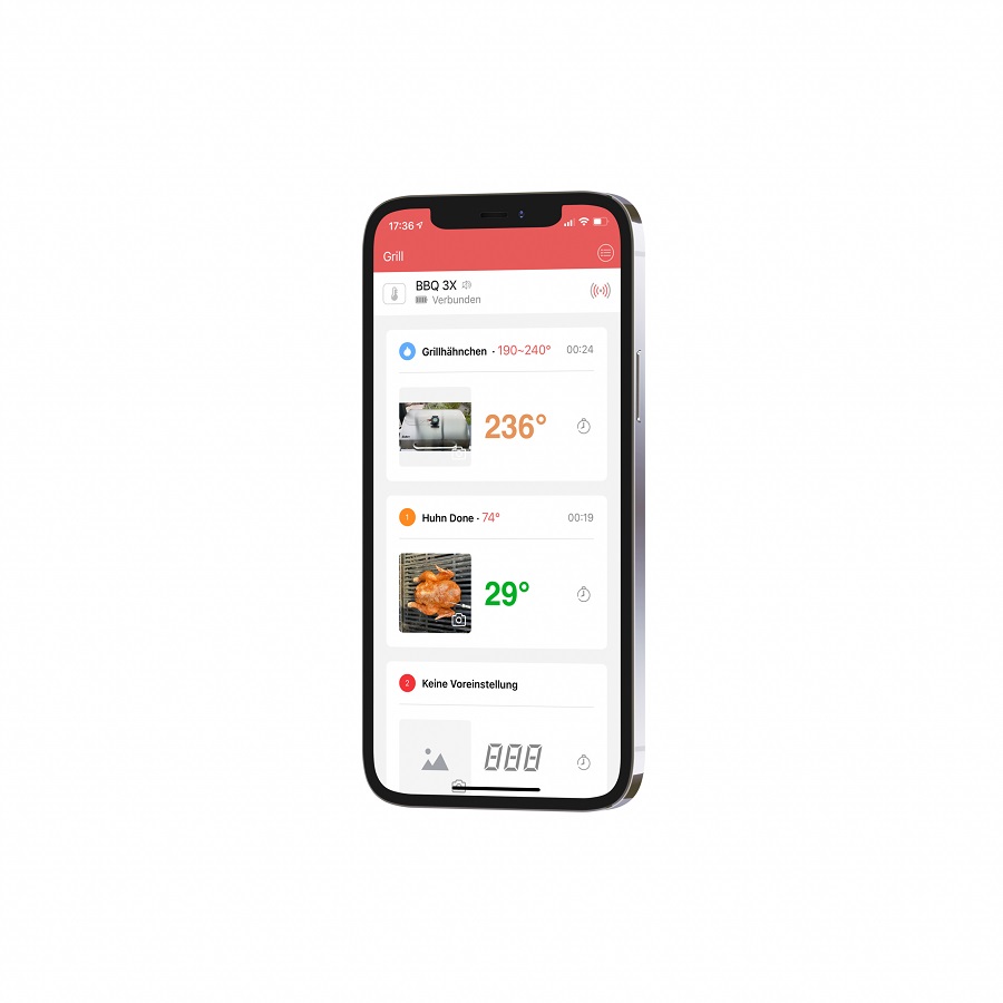 Будь то соковита рвана свинина, свинячі реберця або ніжна свиняча корейка, з розумним бездротовим термометром HYPER BBQ у вас є повний контроль над барбекю. Термометр на кришці показує температуру в робочій камері на дисплеї, що підсвічується, при непрямому грилі із закритою кришкою. У той же час ви можете використовувати два щупові датчики для контролю внутрішньої температури двох продуктів на грилі та точного приготування їх у потоці гарячого повітря. Підключіть термометр до смартфону або планшета через HYPER BBQ, використовуйте попередньо запрограмовані рівні приготування або встановіть всі параметри температури та таймер індивідуально. Слідкуйте за процесом приготування без дротів із мобільним пристроєм на відстані до 50 метрів. Поточні температури та цільові температури відображаються поперемінно у програмі та на дисплеї термометра. Якщо досягнуто бажану внутрішню температуру, час таймера закінчився або температура в робочій камері не залишається в запрограмованих межах, ви можете вибрати різні налаштування сигналів тривоги. Безкоштовна програма доступна німецькою, англійською та ще 6 мовами для iOS та Android™. Щупи з високоякісної нержавіючої сталі залишаються у грилі протягом усього процесу приготування. Вони просто вставляються в м'ясо, а термостійкий кабель виводиться із варильної камери. В комплект входить пристосування для намотування кабелю довжиною 120 см. Термометр Smart Wireless HYPER BBQ можна використовувати як запасну частину або як модернізацію для існуючого барбекю, коптильні, коптильні або візка для гриля. Для кріплення до кришки або капота потрібен отвір діаметром від 9 до 14 мм. Термометр просто вставляється в попередньо просвердлений отвір і фіксується зсередини гайкою, що додається. Металева пластина, що входить до комплекту, захищає пристрій від перегріву.