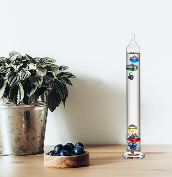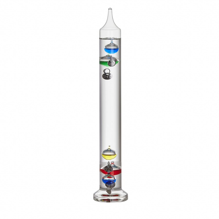 Рідинний термометр виконаний за задумом Галілео Галілея (1564-1642). Галілей виявив, що рідини змінюють свою щільність залежно від температури. Коли температура підвищується, щільність рідини в термометрі зменшується. Порівняно більш важкі скляні колби втрачають плавучість – здатність плавати – і тонуть. З іншого боку, якщо температура в приміщенні знижується, легші скляні колби набувають плавучості і поступово спливають. Різниця у вазі 5 скляних колб розрахована таким чином (з точністю до сотої грама), що найнижча з перерахованих вище плаваючих скляних колб у діапазоні від +18 до +26 °C завжди відображає поточну температуру.