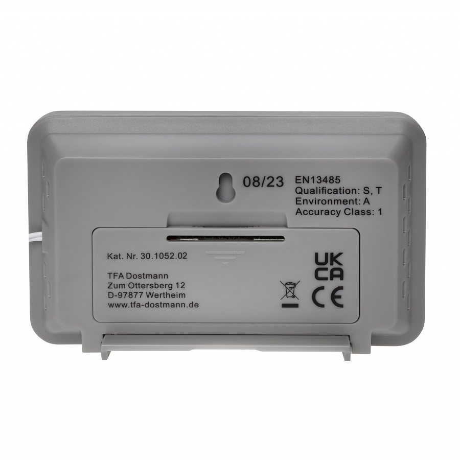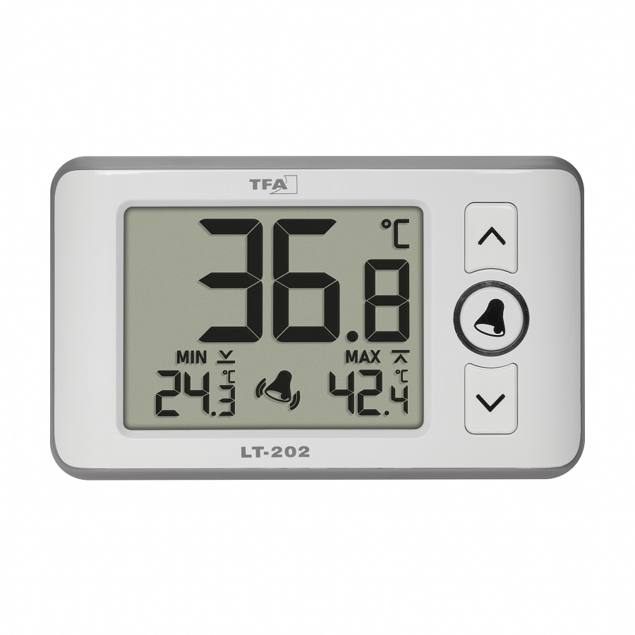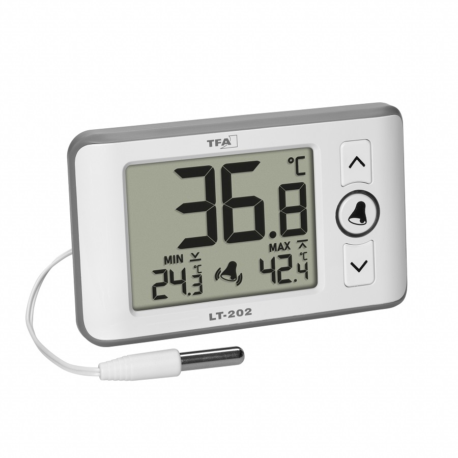 Цей зручний вимірювальний прилад є професійним інструментом для всіх, для кого правильна температура в холодильниках і морозильниках, акваріумах або подібних просторах є головним пріоритетом. Цей цифровий професійний термометр працює з високоякісною сенсорною технологією, щоб відображати температуру з високою точністю в діапазоні вимірювань від -40 °C до +70 °C і подавати сигнал тривоги протягом декількох секунд. Це відбувається, коли температура перевищує або падає нижче встановлених меж сигналізації. Потім цей професійний термометр із зареєстрованим дизайном TFA видає візуальний і звуковий сигнал. Ви можете встановити один із двох рівнів гучності або вимкнути звук. Він інтуїтивно зрозумілий і простий в експлуатації: його чіткий дисплей постійно відображає поточну температуру, а також максимальні та мінімальні значення. Їх можна скинути одним натисканням кнопки. Завдяки свому прибл. двометровому водонепроникному провідному датчику, ви також можете гнучко розмістити температурний сенсор у вологому середовищі або у воді. Дисплейний блок можна прикріпити магнітом до зовнішньої частини морозильної камери чи холодильника або закріпити на стіні на цвяху за допомогою петлі для підвішування. Якщо ви хочете встановити цей професійний термометр на робочому місці, найкраще використовувати вбудовану підставку.