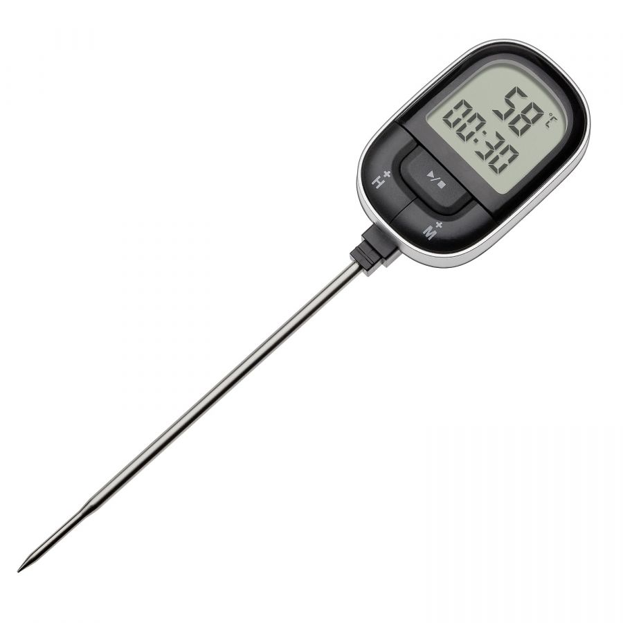 Щуповий термометр на кухні - це не тільки частина основного обладнання амбітних кулінарів. Вам знадобиться надійний вимірювальний прилад, якщо підтримка точної температури під час зберігання, приготування чи подачі їжі відіграє важливу роль на вашій кухні. Особливо під час барбекю або смаження м'яса, птиці та риби ніщо не може піти не так із щуповим термометром. Оскільки окрім якості м’яса, лише правильна температура всередині вирішує, чи стане ваш стейк із яловичини ласощами для смаку чи випробуванням для м’язів щелепи. Чи достатньо охолоджене пиво, щоб ним можна було насолоджуватися? Це також можна швидко перевірити за допомогою щупового термометра. Просто занурте в м’ясо або в рідину щуп із нержавіючої сталі, щоб зчитати температуру. В умовах поганого освітлення дисплей можна підсвітити одним натисканням кнопки, а оптимальний кут читання можна встановити трьома різними положеннями дисплея. Час приготування також можна контролювати за допомогою таймера та секундоміра. Термометр комплектується батарейкою для живлення.