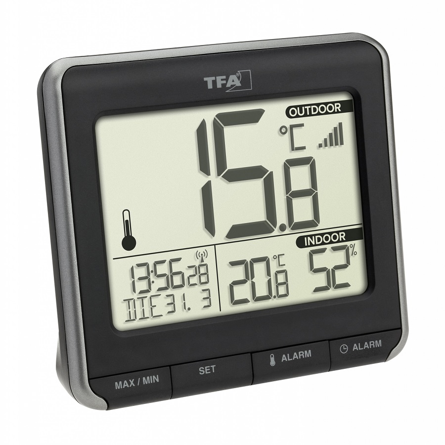 максимальные и минимальные значения могут быть отображены нажатием кнопки. Текущее время и дата принимаются по радиосигналу DCF-77. Будильник