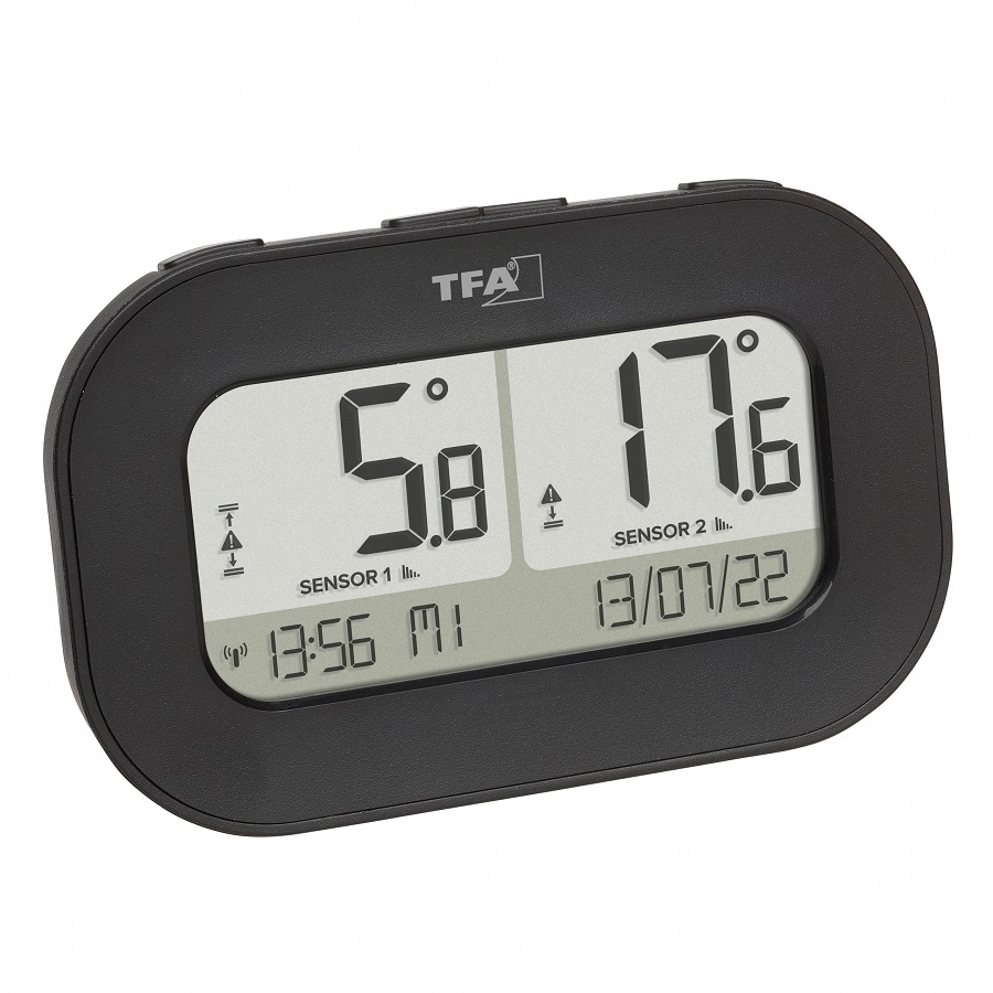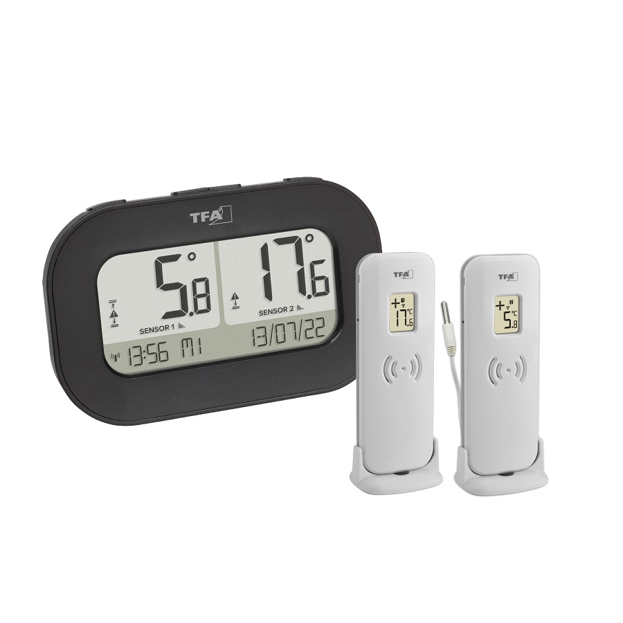 У приміщенні, на вулиці, в басейні, в холодильнику — бездротовий термометр DOUBLE-CHECK можна використовувати будь-де, він є рішенням 2-в-1 для використання в приміщенні та на відкритому повітрі. Зрештою, одного дисплея достатньо, щоб побачити, наскільки тепло на вулиці і чи має ваш басейн потрібну температуру. Чіткий дисплей отримує всі дані бездротовою мережею: дату, день тижня, час і те, наскільки холодно або тепло у двох місцях вимірювання на ваш вибір. Крім базової станції у комплект входять два датчики: бездротовий датчик температури у приміщенні або на вулиці та бездротовий датчик з кабельним сенсором. Водонепроникний кабель довжиною 2 метри ідеально підходить для перевірки температури вашого холодильника, морозильної камери, акваріума, ставка чи басейну. Де б ви не хотіли виміряти температуру, обидва датчики можна розмістити на відстані до 100 метрів від базової станції (відкритий простір). Отже, вже зсередини можна сказати, наскільки освіжаюче буде стрибнути в басейн або у всьому будинку комфортна температура, рибки в акваріумі почуваються комфортно і морозильна камера працює справно. До речі, ви заощаджуєте електроенергію, якщо ваш холодильник та морозильна камера налаштовані правильно. Як вишенька на торті овочі довше залишаються свіжими. У холодильнику повинна бути температура від 5 до 7 °C, а в морозильній — мінімум -18 °C. При правильному налаштуванні бездротовий термометр DOUBLE-CHECK допоможе вам підтримувати ідеальну температуру. Про всяк випадок встановіть температурний сигналізатор. Пристрій записує сигнал тривоги, а також відображаються максимальне та мінімальне значення разом із часом.
