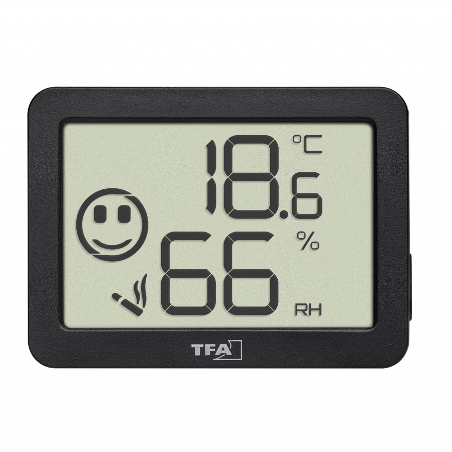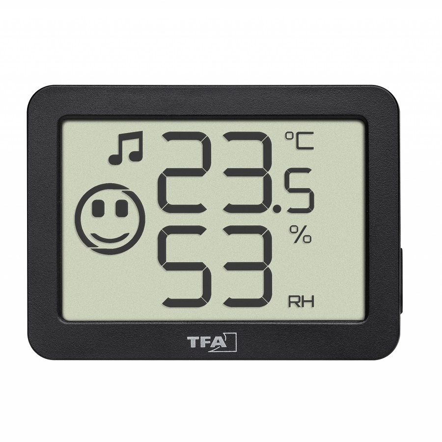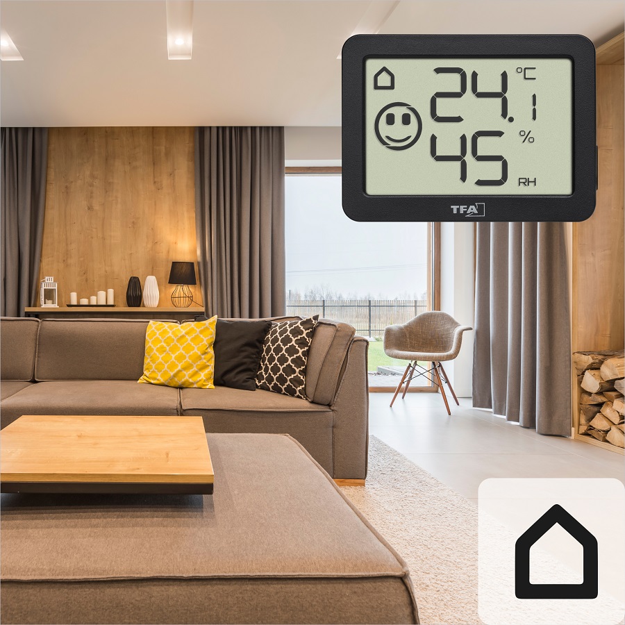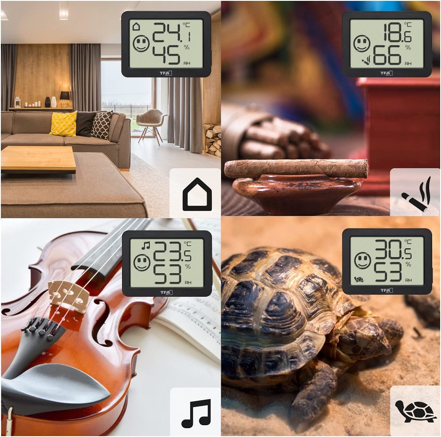 За допомогою цього невеликого та практичного термогігрометра ви можете легко стежити за температурою та вологістю та при необхідності регулювати їх. Максимальні та мінімальні значення зберігаються та відображаються одним натисканням кнопки. Термогігрометр можна прикріпити до металевих поверхонь за допомогою двох маленьких магнітів з тильного боку корпусу або встановити на горизонтальній поверхні за допомогою відкидної підставки. Індикатор кліматичного комфорту у вигляді смайлика класифікує рівень комфорту поточної виміряної температури та вологості: усміхнене обличчя показує, коли кліматичні умови ідеальні. Нейтральне чи сумне обличчя вказує на середні чи погані умови. Ви можете вибрати одну з чотирьох областей застосування термогігрометра: кімнатний клімат, музичні інструменти, черепаха та х'юмідор. Клімат у приміщенні: чи відчуваємо себе комфортно в приміщенні, значною мірою залежить від якості повітря в приміщенні. Контроль температури та вологості в приміщенні за допомогою цілеспрямованого обігріву та вентиляції створює комфортне та здорове місце існування і навіть економить витрати на опалення. Більшості людей комфортна кімнатна температура 19-25°С та відносна вологість 40-60%. Цей діапазон також мінімізує ризики для здоров'я. Музичні інструменти. Дерев'яні музичні інструменти, такі як піаніно, скрипки та гітари, чутливі до кліматичних умов. Дерево – гігроскопічний матеріал; при високій вологості повітря волога вбирається і предмети можуть деформуватися. Якщо навколишнє повітря занадто сухе, з нього витягується волога, з'являються тріщини. Оптимальні кліматичні умови для багатьох музичних інструментів 18-24°С та відносна вологість 45-55%. Будь ласка, перевірте, чи ці значення застосовуються до вашого власного приладу. Особливо важливо при зберіганні музичних інструментів: кліматичні умови повинні залишатися якомога постійнішими. Слідкуйте за збереженими максимальними та мінімальними значеннями та уникайте сильних коливань температури та вологості. Черепаха: як холоднокровні тварини, черепахи, які у тераріумі, залежать від достатньої кількості джерел тепла. Занадто сухі умови утримання можуть призвести до хвороби та зневоднення. Умови для режиму "Черепаха" відповідають ідеальним умовам для європейської черепахи. У фазі активності оптимальні 25-32°С і відносна вологість 45-65%. Обов'язково уточніть, чи можуть для вашого виду черепах бути необхідними інші умови утримання. Х'юмідор: Високий рівень вологості має важливе значення для терміну придатності сигар. Саме тому сигари зберігаються у спеціальному контейнері із вбудованою системою зволоження – х'юмідорі. При відносній вологості 65–75% та температурі 18–22°С більшість видів сигар повністю зберігають аромат і можуть зберігатися роками.