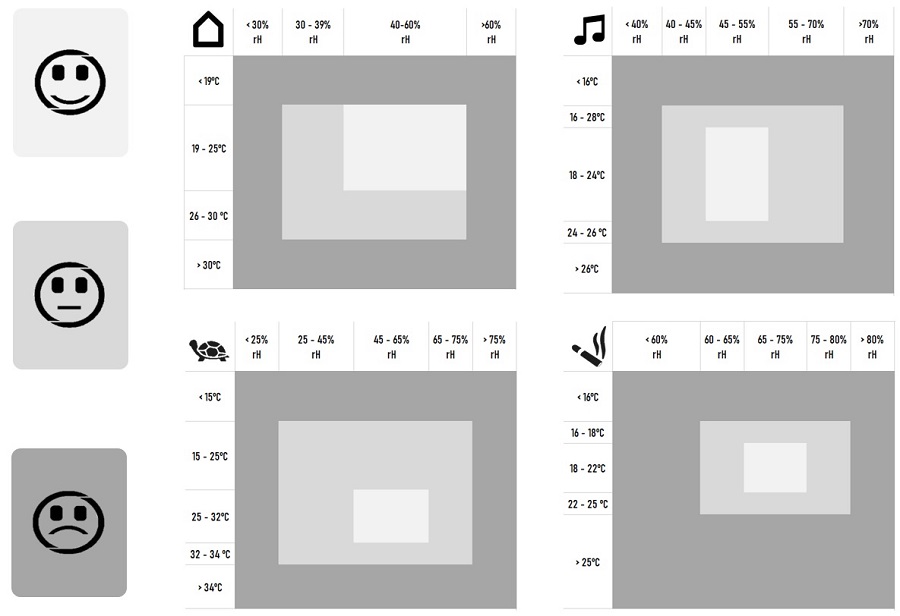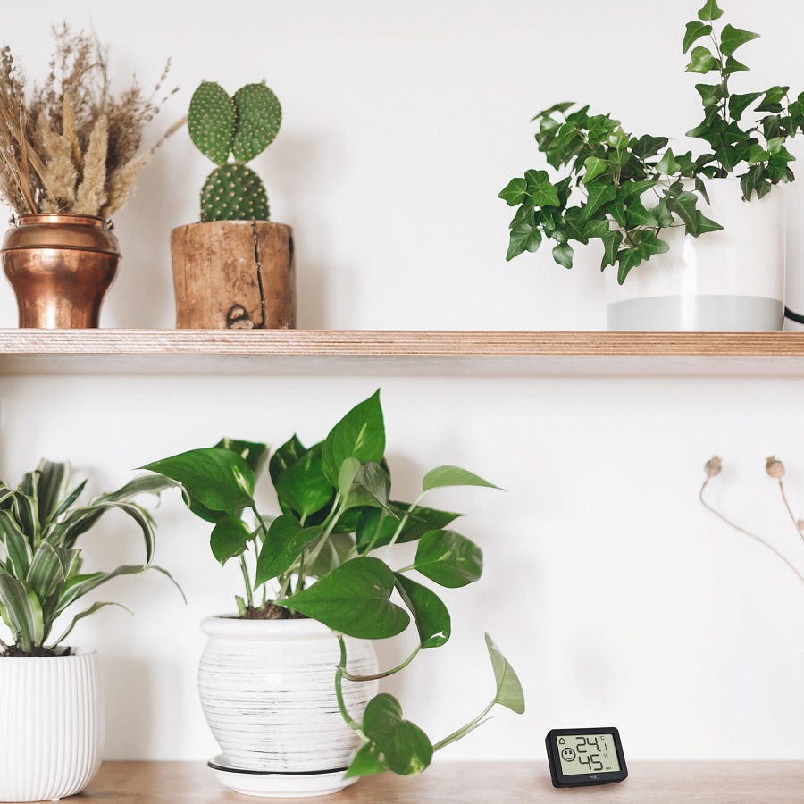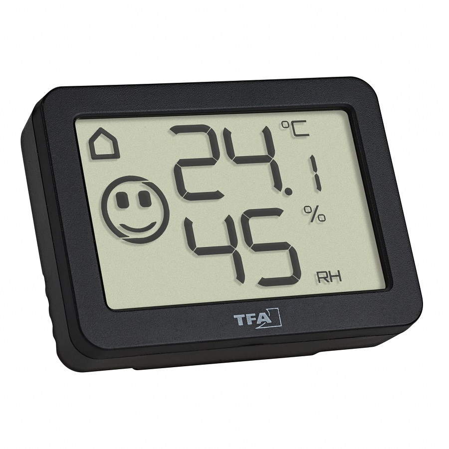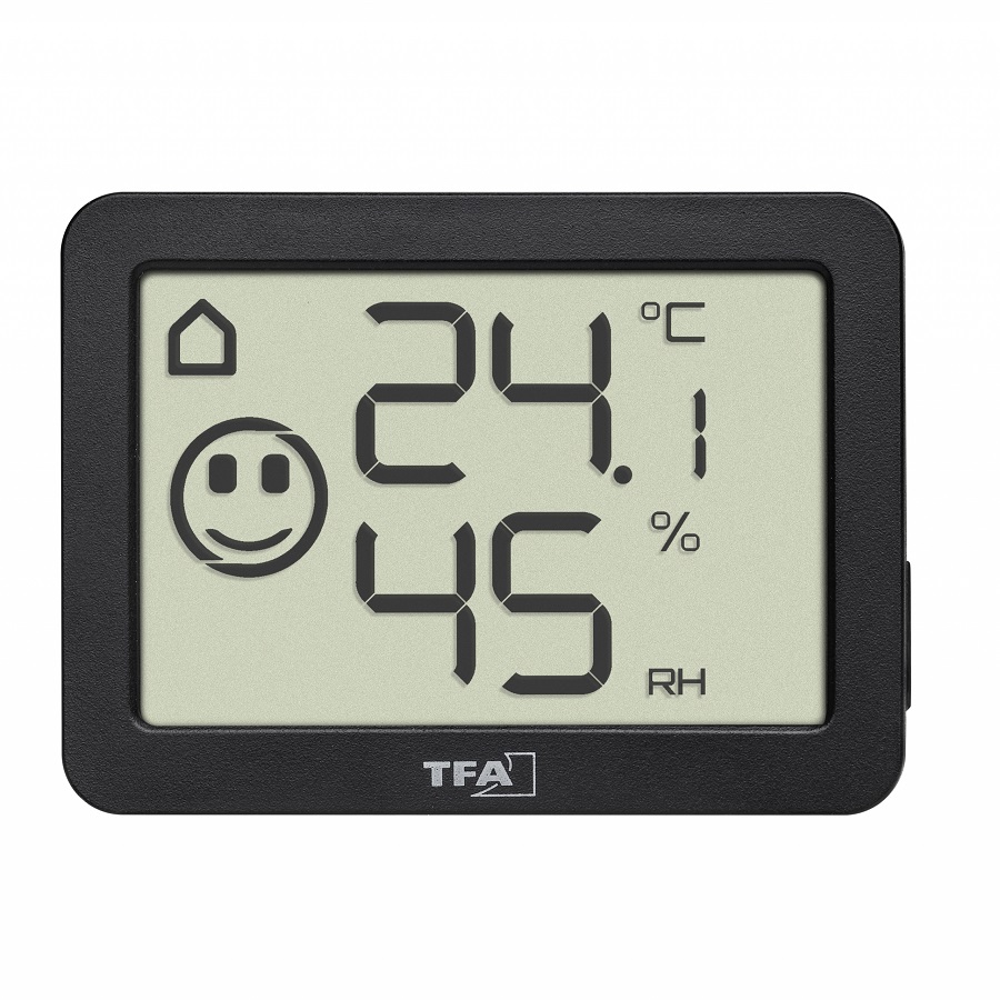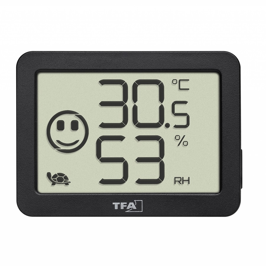 За допомогою цього невеликого та практичного термогігрометра ви можете легко стежити за температурою та вологістю та при необхідності регулювати їх. Максимальні та мінімальні значення зберігаються та відображаються одним натисканням кнопки. Термогігрометр можна прикріпити до металевих поверхонь за допомогою двох маленьких магнітів з тильного боку корпусу або встановити на горизонтальній поверхні за допомогою відкидної підставки. Індикатор кліматичного комфорту у вигляді смайлика класифікує рівень комфорту поточної виміряної температури та вологості: усміхнене обличчя показує, коли кліматичні умови ідеальні. Нейтральне чи сумне обличчя вказує на середні чи погані умови. Ви можете вибрати одну з чотирьох областей застосування термогігрометра: кімнатний клімат, музичні інструменти, черепаха та х'юмідор. Клімат у приміщенні: чи відчуваємо себе комфортно в приміщенні, значною мірою залежить від якості повітря в приміщенні. Контроль температури та вологості в приміщенні за допомогою цілеспрямованого обігріву та вентиляції створює комфортне та здорове місце існування і навіть економить витрати на опалення. Більшості людей комфортна кімнатна температура 19-25°С та відносна вологість 40-60%. Цей діапазон також мінімізує ризики для здоров'я. Музичні інструменти. Дерев'яні музичні інструменти, такі як піаніно, скрипки та гітари, чутливі до кліматичних умов. Дерево – гігроскопічний матеріал; при високій вологості повітря волога вбирається і предмети можуть деформуватися. Якщо навколишнє повітря занадто сухе, з нього витягується волога, з'являються тріщини. Оптимальні кліматичні умови для багатьох музичних інструментів 18-24°С та відносна вологість 45-55%. Будь ласка, перевірте, чи ці значення застосовуються до вашого власного приладу. Особливо важливо при зберіганні музичних інструментів: кліматичні умови повинні залишатися якомога постійнішими. Слідкуйте за збереженими максимальними та мінімальними значеннями та уникайте сильних коливань температури та вологості. Черепаха: як холоднокровні тварини, черепахи, які у тераріумі, залежать від достатньої кількості джерел тепла. Занадто сухі умови утримання можуть призвести до хвороби та зневоднення. Умови для режиму "Черепаха" відповідають ідеальним умовам для європейської черепахи. У фазі активності оптимальні 25-32°С і відносна вологість 45-65%. Обов'язково уточніть, чи можуть для вашого виду черепах бути необхідними інші умови утримання. Х'юмідор: Високий рівень вологості має важливе значення для терміну придатності сигар. Саме тому сигари зберігаються у спеціальному контейнері із вбудованою системою зволоження – х'юмідорі. При відносній вологості 65–75% та температурі 18–22°С більшість видів сигар повністю зберігають аромат і можуть зберігатися роками.