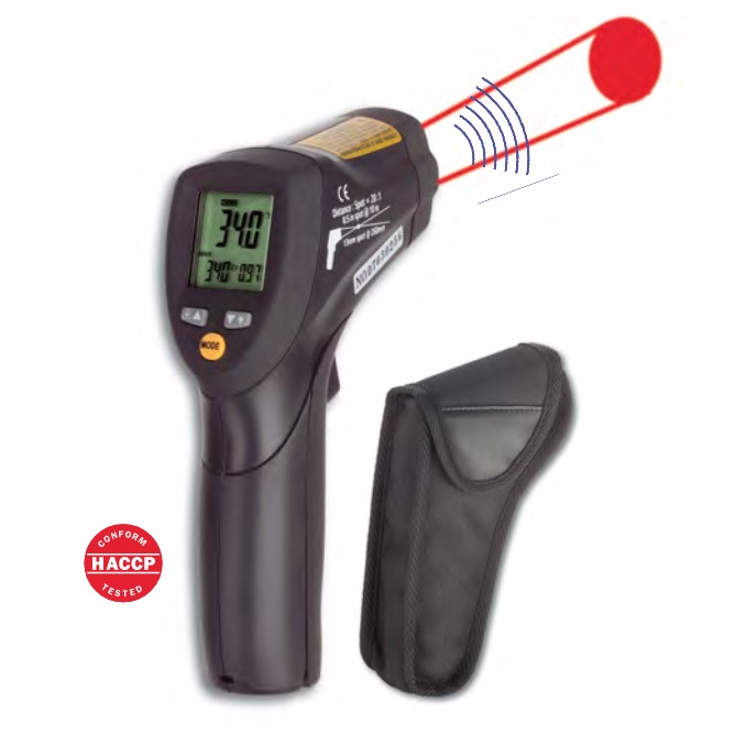 С помощью инфракрасного термометра можно измерить температуру поверхностей быстро и легко, не касаясь их. Просто направьте точку лазерного указателя термометра на объект измерения, нажмите на кнопку и через секунду на дисплее термометра отобразится значение температуры. Встроенный лазерный указатель поможет вам точно навести термометр на место измерения. Текущая температура отображается на дисплее с тыльной подсветкой. Применение инфракрасных термометров разнообразно. Вы можете использовать его для контроля систем кондиционирования воздуха и отопления, обнаружить места сквозняков в окнах или проверить тормозную систему в автомобиле. Также можно проверить температуру детского питания, напитков, воды для купания, масла для приготовления пищи, джема или горячего шоколада. Идеально подходит для продуктов питания, в соответствии с HACCP.