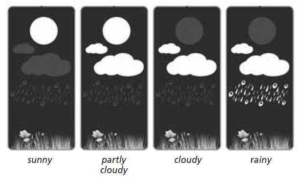 погоды: (солнечно, переменная облачность, облачность, дождь). Пиктограмма Солнца