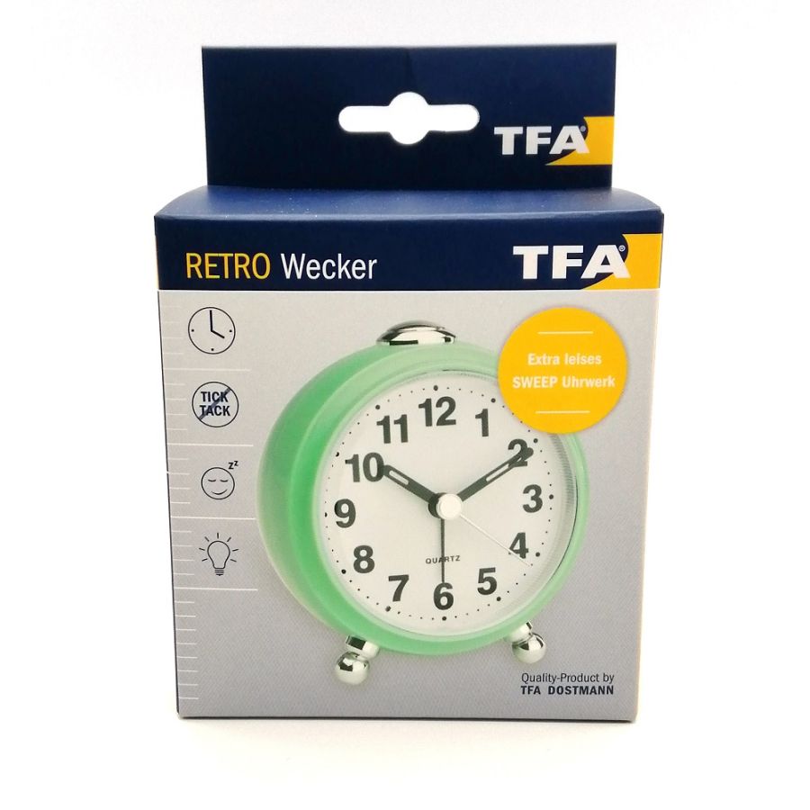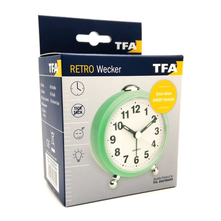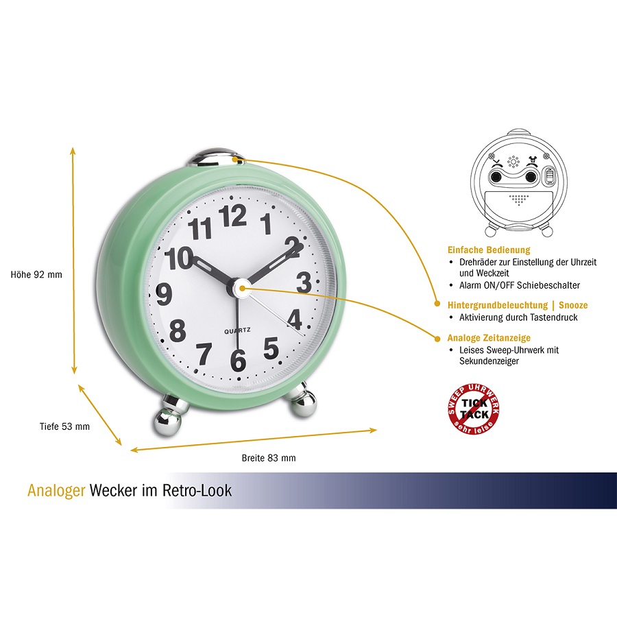 З цим будильником у стилі ретро ви завжди будете стежити за часом – навіть у темряві завдяки підсвічуванню. Його механізм працює особливо тихо, тому він не заважатиме вам спати. Функція відкладення дає вам ще кілька хвилин, щоб встати з ліжка вранці. Кварцовий годинник підходить як будильник для подорожей завдяки зручному розміру.