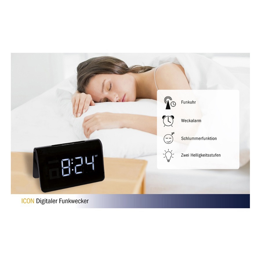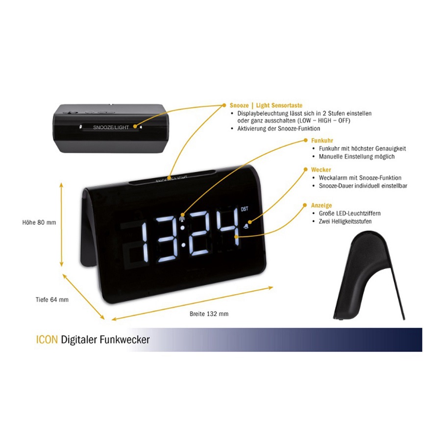Радіокерований будильник ICON від TFA показує час великими світлодіодними цифрами, що світяться, і його легко читати навіть у темряві. Яскравість можна встановити на двох рівнях; опційно можна повністю відключити дисплей. Поточний час автоматично приймається за допомогою радіосигналу DCF77 і оновлюється щодня. Час відображається на безрамковому дисплеї, а закруглений край плавно переходить у ніжку. Дизайн ICON справляє враження своєю витонченою чіткістю, що, своєю чергою, дозволяє цьому радіокерованому будильнику гармонійно вписатися в будь-яку обстановку. Завдяки вбудованому будильнику ви завжди добре починаєте день. А якщо ви не хочете відразу вставати, ви можете прокинутися за кілька хвилин за допомогою функції повтору. Тривалість повтору регулюється індивідуально