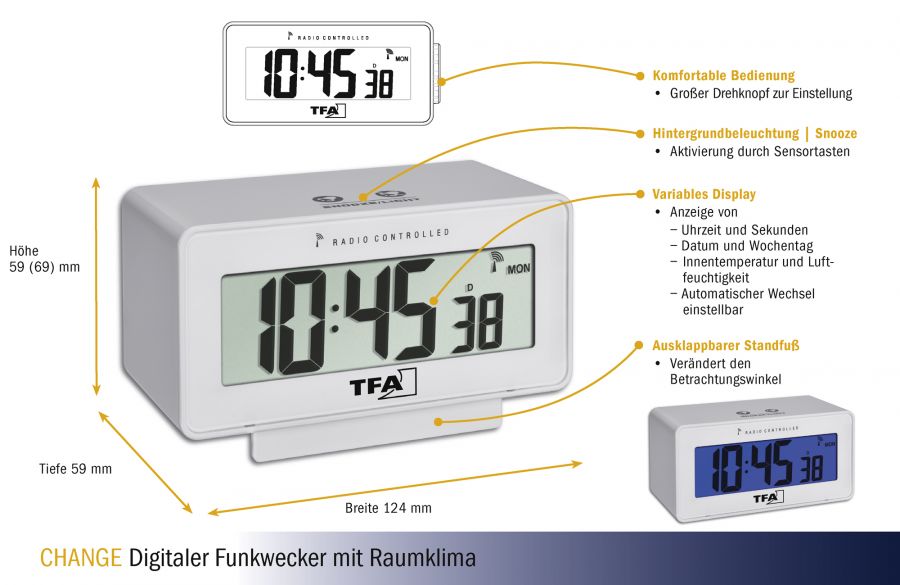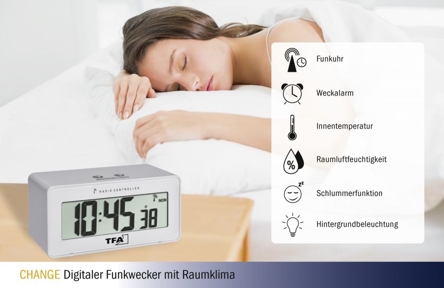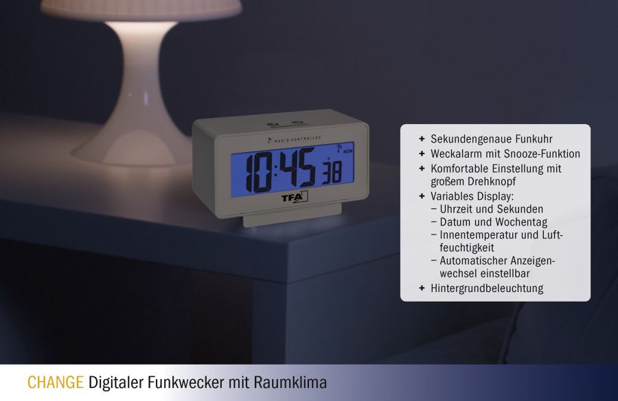 Беспроводной будильник «CHANGE» предлагает специальные функции: четкий дисплей можно настроить так, чтобы время с