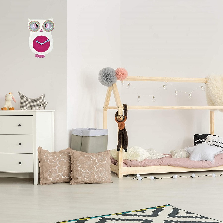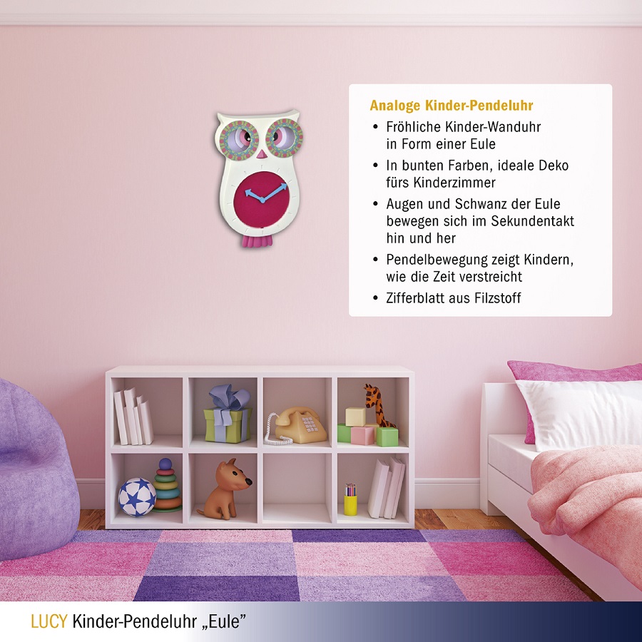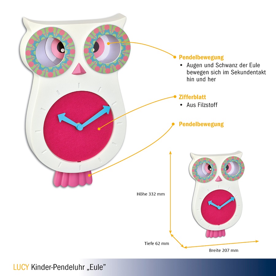 Веселые детские часы с маятником в виде совы - поистине оригинальное украшение для детской комнаты. Дети любят разноцветные вещи, а совы возглавляют список любимых животных. LUCY с белым корпусом и розовым войлочным циферблатом идеально впишется в типичную девичью комнату. Глаза обрамлены необычным узором, а разноцветный хвост совы движется вперед и назад по секундам. Маятниковое движение часов дает детям ощущение того, как проходит время. Это делает настенные часы красивым и в то же время полезным аксессуаром.