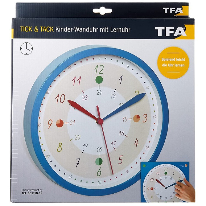Навчитися визначати час простіше. Ніколи ще навчитися читати годинник не було так весело, як з нашим набором дитячого годинника TICK & TACK. Набір складається з настінного годинника і відповідного іграшкового навчального годинника. Ретельно продуманий і з любов'ю оформлений настінний годинник здивує вас безліччю особливих деталей. Іграшковий навчальний годинник ідеально підходить для тренування, щоб визначати час, а час можна встановити за допомогою рухомих стрілок з картону, а потім перевірити. Іграшковий годинник не тільки вчить визначати час, але й розвиває дрібну моторику дитини. Циферблати навчального та настінного годинників повністю ідентичні. Це полегшує дитині впізнавання на «справжньому» годиннику того, що він вивчив на іграшковому годиннику, і визначення часу. Численні маркування допомагають дізнатися час, наприклад, розрізняти години та хвилини та правильно вживати такі терміни, як «чверть» та «половина». Хвилини позначені крапками на зовнішньому кільці та пронумеровані за п'ять одиниць. Годинни з 1 до 12 години надруковані в середньому кільці, а з 1 до опівночі — у внутрішньому кільці. Четверті інтервали (чверть, половина, за чверть та повна година) відображаються у вигляді маленького кола. Яскраві кольори не тільки мотивують дитину під час навчання, але й чудово виглядатимуть у будь-якій дитячій кімнаті. Оскільки юні хронометристи повинні добре володіти цифрами, ми рекомендуємо починати вчитися визначати час від 5 до 6 років. Діти повинні вміти читати по годиннику не пізніше другого класу.