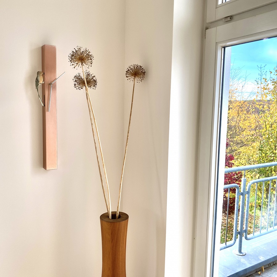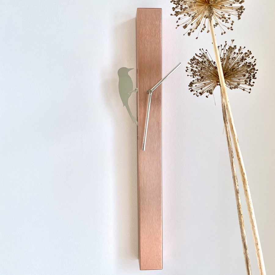 Той, хто шукає стильний годинник для вітальні, не повинен пропустити цей пуристичний годинник з маятником з лакованого алюмінію. Модний колір рожевого золота приносить у ваш будинок нотку розкоші. Сяючий маленький дятел кожну секунду рухається вперед і стукає по символічному стовбуру дерева. Рух маятника створює унікальні коливання і ви відчуваєте, як тече час. Хромовані стрілки з плавним ходом вказують час.