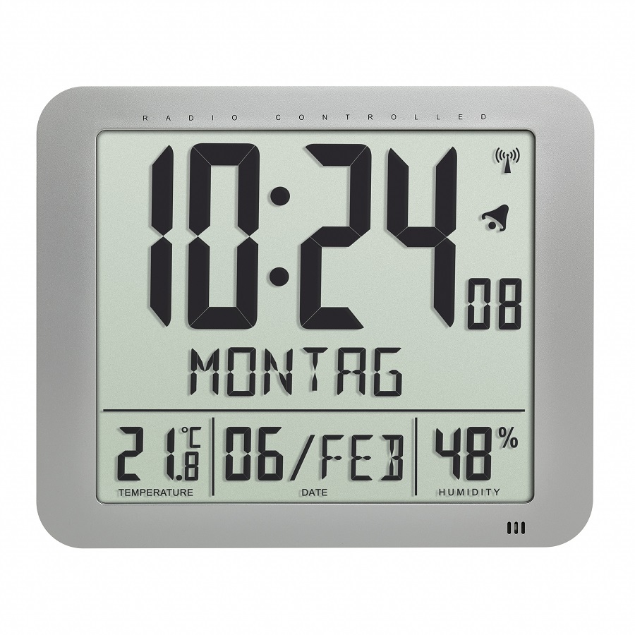 Цей цифровий радіокерований годинник показує вам більше, ніж просто час. Ви можете одразу побачити день тижня, дату, температуру та вологість. Завдяки великому чіткому дисплею дані можна легко зчитувати навіть здалеку – ідеально, якщо у вас просторі кімнати або ви хочете бачити час на стіні вітальні за столом для сніданку. Інформація чітко розташована в трьох рядках і візуально розділена лініями. Це полегшує орієнтацію на дисплеї. День тижня написаний і може відображатися англійською та дев'ятьма іншими мовами. Інший часовий пояс також можна встановити вручну. Годинник приймає сигнал часу по радіо і подає його в цифровому вигляді. Він активує будильник, лише якщо ви цього хочете, і якщо ви використовуєте будильник із функцією короткого сну. Таким чином, годинник швидко стане будильником на вашій тумбочці або на столику біля дивана. Забезпечте здоровий клімат у приміщенні, підтримуючи температуру та вологість у зоні комфорту. Часто температура в кімнаті вища, ніж ви думаєте, і це витрачає непотрібну енергію. Щоб гарантувати, що цей цифровий радіокерований годинник добре виглядатиме в атмосфері кожної кімнати, він має простий і позачасовий дизайн. Його срібляста рамка обрамляє дисплей, а на задній панелі є допоміжний пристрій для підвішування на стіні та підставка для встановлення годинника.
