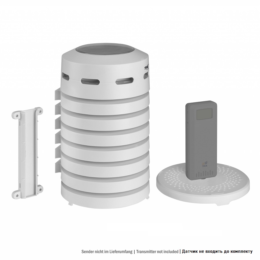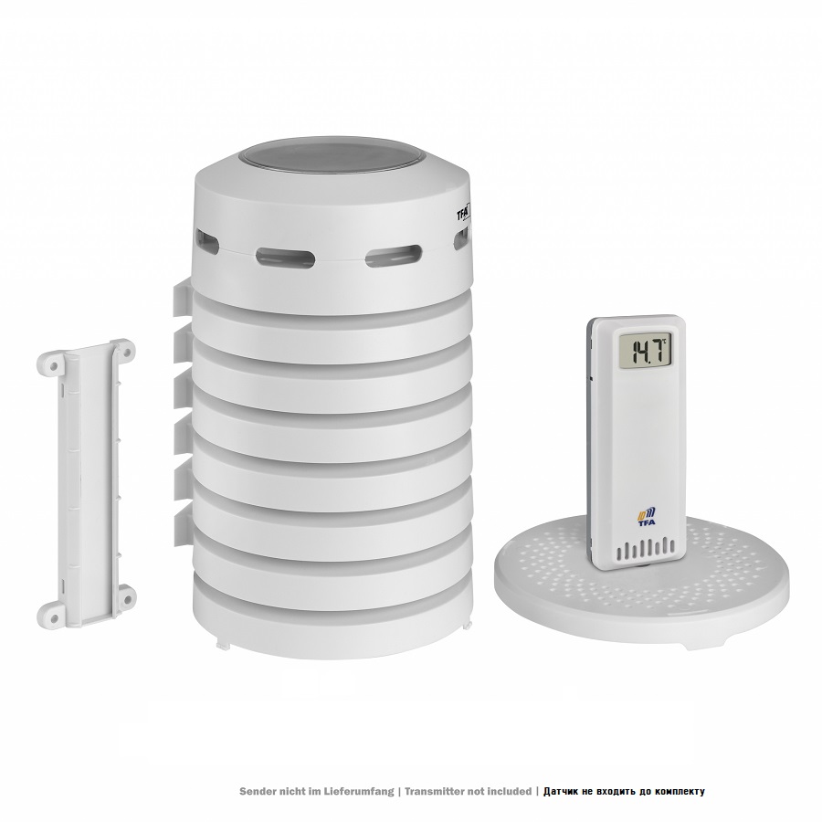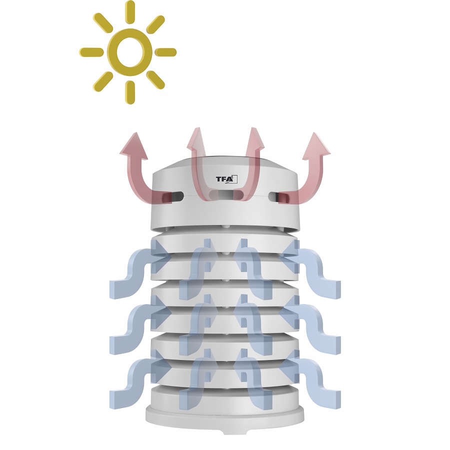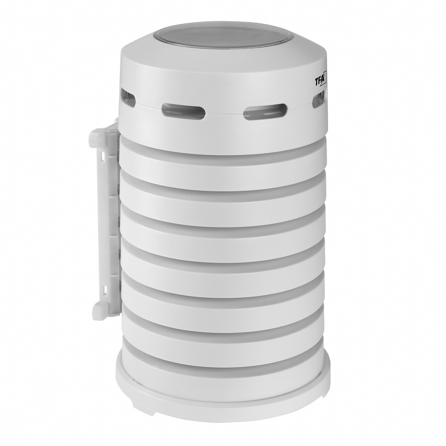 Цей практичний ковпак із зареєстрованим дизайном TFA не тільки захищає ваш термо- або гігропередавач від сонця та дощу, але й має вбудований вентилятор, що забезпечує точні показники навіть під прямими сонячними променями. Вентилятор живиться виключно від сонячної панелі. Проникна конструкція захисного кожуха і циркуляція повітря всередині, що створюється вентилятором, запобігає накопиченню гарячого повітря і, таким чином, дозволяє уникнути спотворення результатів вимірювань. Захисний ковпак можна без проблем розміщувати в будь-якому місці на відкритому повітрі, оскільки датчик також захищений від атмосферних опадів. Завдяки зручному відкриванню захисний ковпак також ідеально підходить для датчиків з кабельними сенсорами. Легко монтується завдяки монтажному матеріалу, що додається в комплекті.